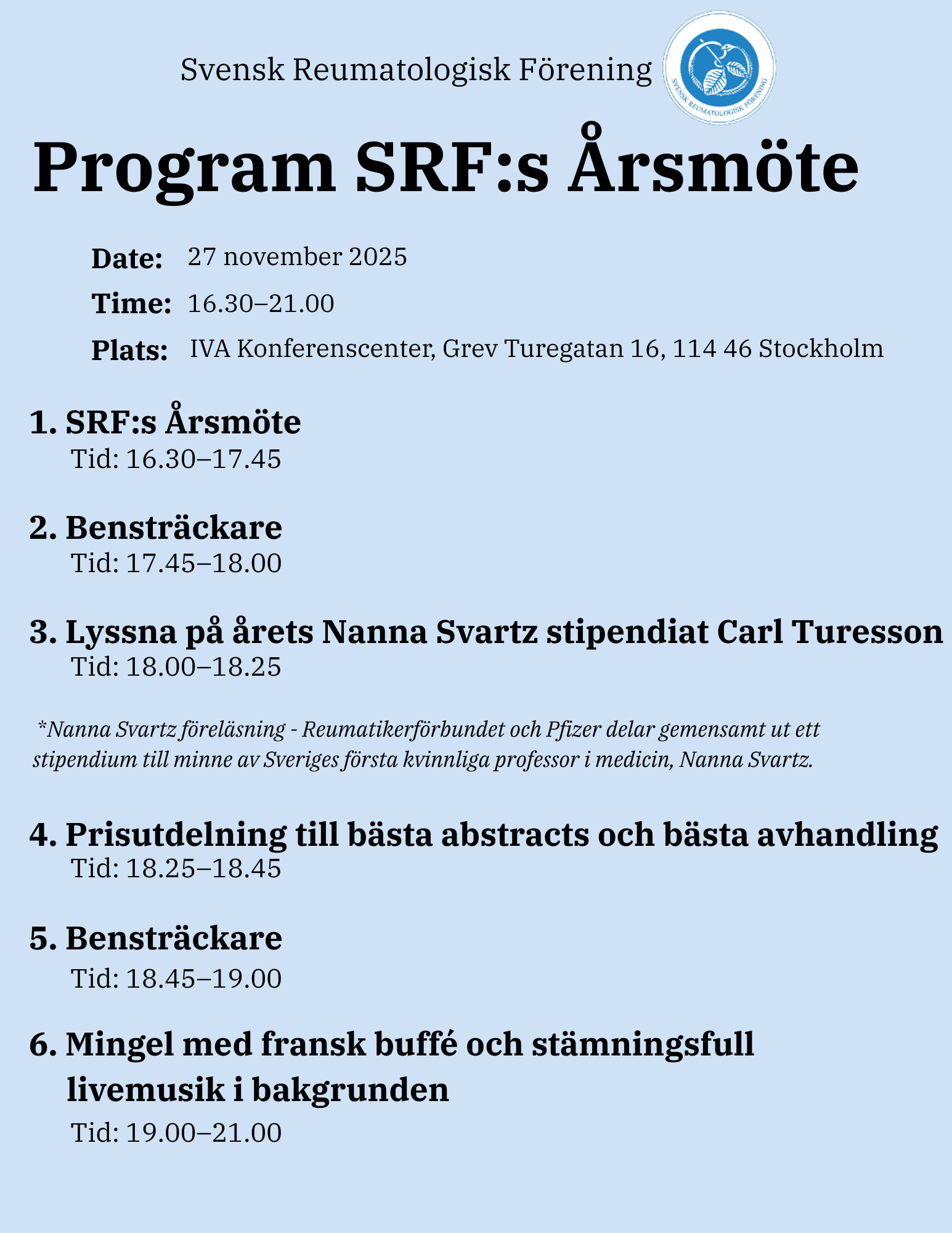 SRF:s årsmöte hålls den 27 november 2025 kl.16.30–17.45 på IVA Konferenscenter i Stockholm.